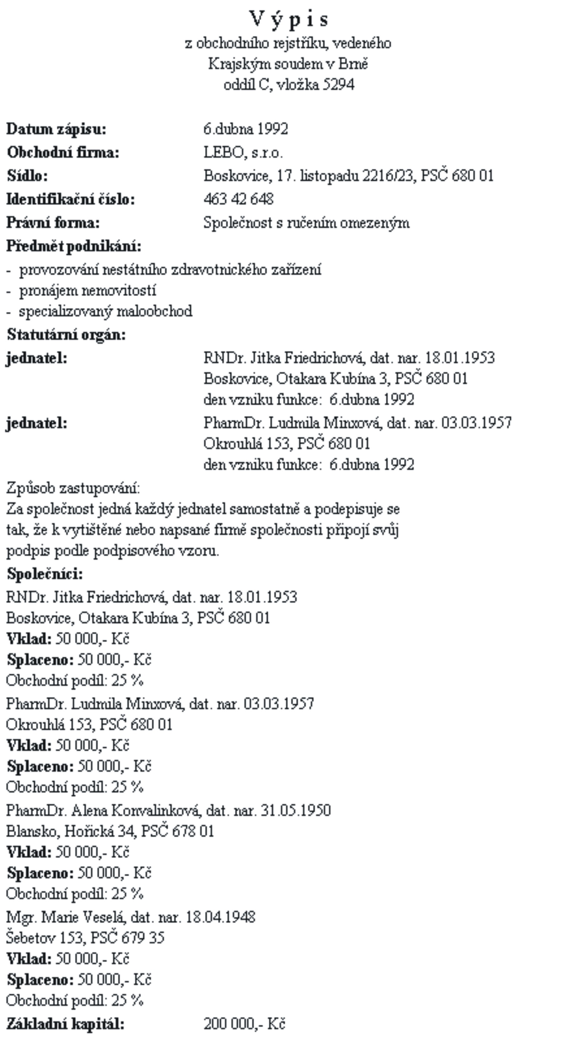 Firma je zapsána v obchodním rejstříku, vedeném u Krajského soudu v Brně, oddíl C, vložka 5294, dne 6.dubna 1992.